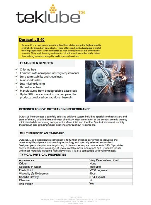 Duracut HNF Is a technically advanced low viscosity neat cutting fluid specifically formulated as a carbide and flute and form grinding fluid. Formulated from severely refined enhanced high viscosity index mineral oil and synthetic base stocks, with added extreme pressure and lubricity additives. This produces excellent machining performance and extended wheel life, in many established flute and form grinding operations where a low viscosity fluid is required or specified.